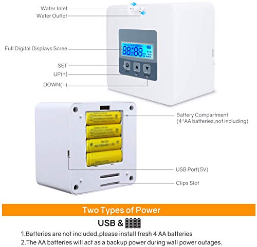 Due tipi di alimentazione elettrica. 4 batterie AA (non incluse) che possonodurare 2 mesi per un minuto di irrigazione una volta al giorno.Oppure ricarica tramite micro USB, più comoda per quando si va in vacanza. A basso consumo energetico e ecologico.