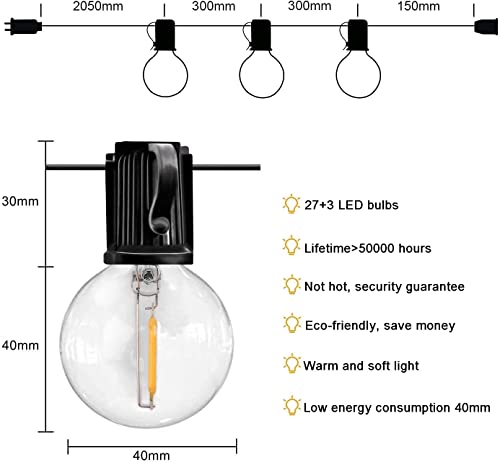 Catena di luci decorative: la catena luminosa da 10 m per esterni è composta da 27 lampadine LED con 3 lampadine di ricambio. Ogni lampadina è 0,6 W e 2700 K. L’illuminazione crea un’atmosfera retrò e calda per grigliate serate, cene di famiglia e conversazioni notturne tra amici. Puoi goderti la notte fino a tardi.