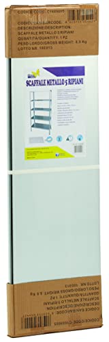 Prodotto a 5 ripiani, misure: H 187 x L 100 x P 30 cm, metallo galvanizzato, portata: 50 Kg per ripiano con carico uniformemente distribuito, spessore ripiani: 0,5 mm, spessore montanti: 0,5; 4 piedini in plastica