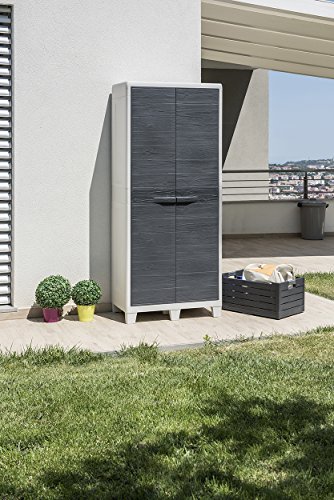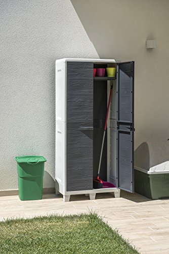Armadio a 2 ante effetto legno con vano porta-attrezzi, 3 ripiani riposizionabili e blocco ripiano anti-ribaltamento. Per interni.