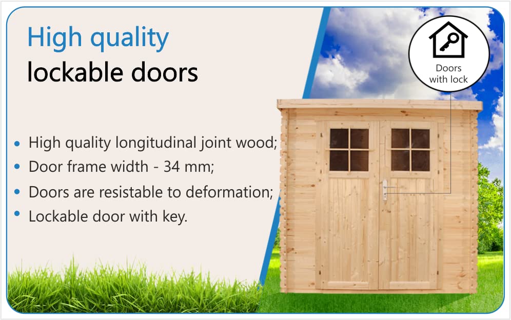 AMPIO STOCCAGGIO ESTERNO DI FACILE ACCESSIBILITÀ. Grazie alle doppie porte di altezza 177 cm, non farete fatica a muovere oggetti dalla vostra casetta da giardino in legno. Le due finestre in plexiglass favoriscono luminosità e visibilità.